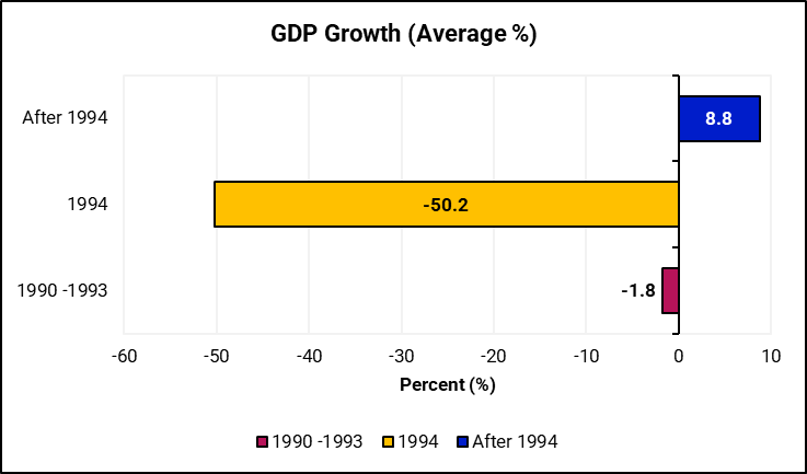 From figure (3), before 1994 (i.e., 1990-1993), GDP growth averaged 1.8% below zero, reflecting instability and inefficient use of resources. In 1994, it plunged to -50.2% due to the devastation of genocide against the Tutsi.