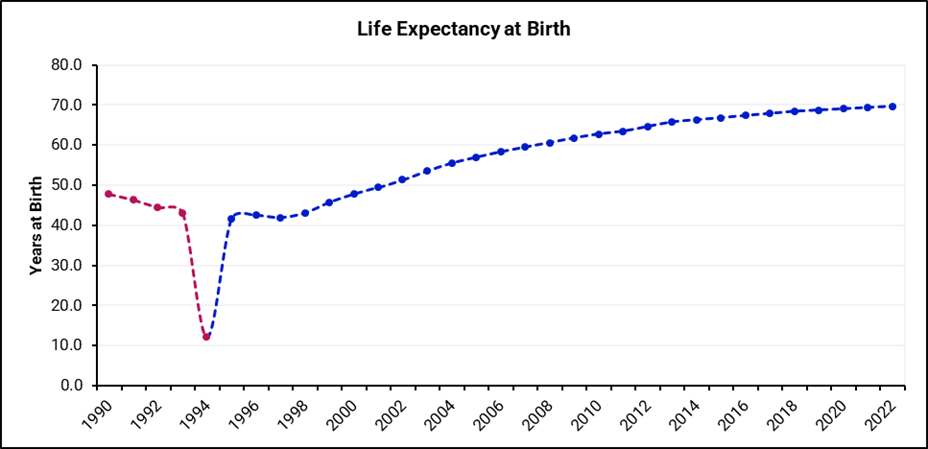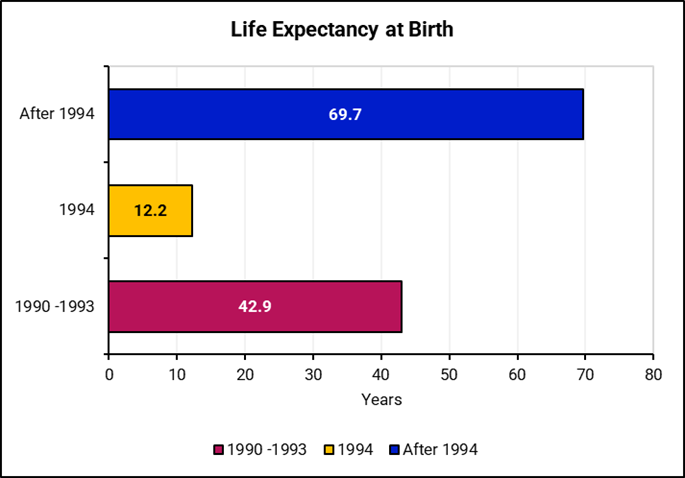 The 1994 genocide caused a devastating plunge in life expectancy to a mere 12.2 years due to the crumbling of the healthcare system and deaths.