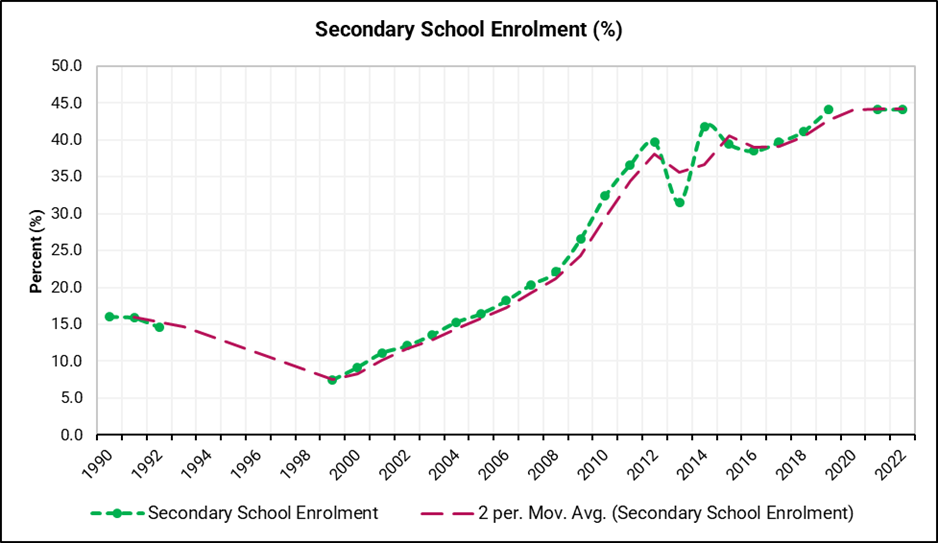 The proof of this can be seen easily in the chart below. The chart shows that in the pre-1994 period, enrolment stagnated below 20% from 1990 with a declining trend. Post-genocide enrolment climbed from only 7.5% in 1999 to 44.2% in 2022 as Rwanda completely transformed its education system.