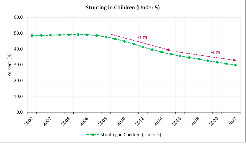 Only within 14 years, between 2009 and 2022, stunting was cut by 16.6%, from about 46% to 29.8%. Under the National Strategy for Transformation, this value is expected to be cut by half to 15% in 2029.